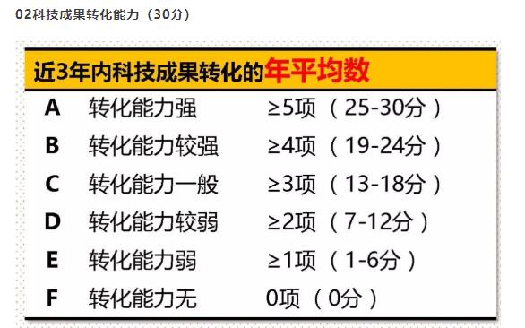 ①由技术专家根据企业科技成果转化总体情况和近3年内科技成果转化的年平均数进行综合评价。同一科技成果分别在国内外转化的,或转化为多个产品、服务、工艺、样品、样机等的,只计为一项。②科技成果转化的计算是按照一个成果对应一个转化,要想获得高分必须产生15个不同的科技成果,尽量多申请相关知识产权等;每个成果确认转化为不同的产品、服务、工艺、样品、样机、检测、查新、试用等证明。6、研发组织管理水平