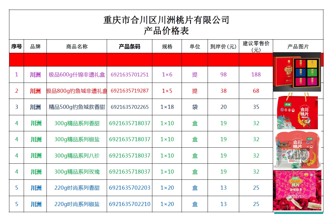 您当前位置:网站首页 >> 方便食品 >> 重庆市合川区川洲桃片 >> 重庆市合川区川洲桃片有限公司产品价格表