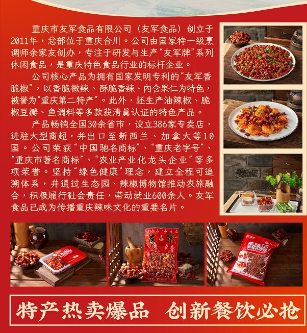 重庆市友军食品有限公司简介2025-09-02 11:55:54 来源:合川三展中心 浏览:7次重庆市友军食品有限公司(友军食品)创立于2011年,总部位于重庆合川。公司由国家特一级烹调师余家友创办,专注于研发与生产“友军牌”系列休闲食品,是重庆特色食品行业的标杆企业。 公司核心产品为拥有国家发明专利的“友军香脆椒”,以香脆微辣、酥脆香辣、内含果仁为特色,被誉为“重庆第二特产”。此外,还生产油辣椒、脆椒豆瓣、鱼调料等多款获清真认证的特色产品。 产品畅销全国30余省市,设立386家专卖店,进驻大型商超,并出口至新西兰、加拿大等10国。公司荣获“中国驰名商标”、“重庆老字号”、“重庆市著名商标”、“农业产业化龙头企业”等多项荣誉。坚持“绿色健康”理念,建立全程可追溯体系,并通过生态园、辣椒博物馆推动农旅融合,积极履行社会责任,带动就业600余人。友军食品已成为传播重庆辣味文化的重要名片。