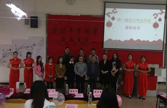 重庆市合川区财政与会计协会秘书长戴伽俐对学校会计专业协会的成立表示祝贺,并结合当前会计专业的社会发展形势为会计专业学生发展提出三点建议:一是了解专业发展形势,明确职业发展方向;二是制定职业生涯规划,明白“来日并不方长,选择决定未来”;三是朝着复合型人才发展,扎实专业理论基础。 随后,大会进行剪彩仪式并合影留念。