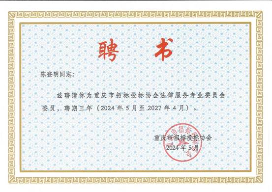 四、再次祝贺 我们再次对陈登明的荣任表示热烈的祝贺,并期待在新的岗位上再创佳绩,为推动行业法治化建设贡献力量。同时,我们也对重庆市招标投标协会法律服务专业委员会的成立表示最诚挚的祝贺,期待其在行业发展中发挥重要作用。
