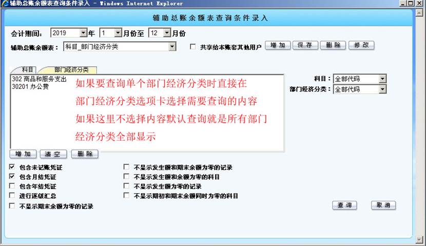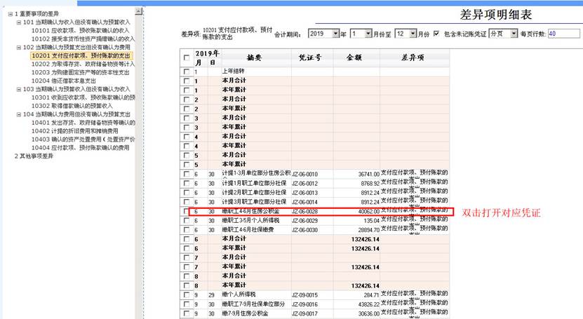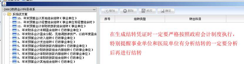 注意:以下皆为演示数据,实际操作以实际操作为准 现我们系统根据标准经济业务事项,按照政府会计制度13类差异项在凭证中自动补录这13类差异事项,自动补录的差异项可取消,系统自动补录的差异项大家一定要去核对,由于我们各个单位在编制凭证时有差异,系统自动补录的差异项不一定完全准确,请大家一定要核对 操作如下: 1. 账务处理系统 /定期处理/补充登记差异项 2. 选择凭证日期,在未登记凭证选项卡,勾选所有凭证,选择全部差异事项,点击批量登记,待批量登记完成即可在已登记凭证选项卡查看 3. 所有凭证登记完差异后在账务处理系统 /结余与盈余差异项/差异项明细表查询明细 4. 修改有误差异项 选中对应有误差异项凭证,双击打开凭证,点击差异项,选择编辑,更改差异项后点击其他空白处,点击保存即可完成更新 1. 往来辅助核算 往来辅助核算请大家一定要按照我们给大家统一设置往来辅助核算类别,不然后面我们统一为大家预置的附注报表不能自动生成数据,附注报表数据需要单位自己手工录入 2. 拨款种类辅助核算 拨款种类由于年初在财政拨款结转结余科目漏掉了,年底有财政拨款预算收入支出表,这张报表是按照一般公共预算和政府性基金预算设置,因此如果这两个科目没有设置拨款种类辅助时就不能使用我们预置的报表自动取数 今年是第一年实行政府会计制度,在进行年底结转时请大家一定要按照政府会计制度要求,按照对应的先后顺序进行结转,系统在预置结转方案时默认都是严格按照政府会计制度执行后的操作,请注意我们给大家编写了一个先后顺序的,有先后顺序的一定要前一结转完成后凭证记账后才能进行下一个结转 1. 科目账 科目账分为财务会计和预算会计科目账,注意非政府会计制度的账套还是只有账务会计科目账,没有预算会计科目 1.1财务会计科目账 余额表 点击账务处理系统 /财务会计科目账/余额表,选择对应会计期间即可查询出所有数据 明细账表 明细账表的查询方法与余额表查询的方法一样,不再重复 1.2预算会计科目账表的查询和财务会计的账表查询相同,不再重复叙述 2. 辅助账 2.1财务会计辅助账 点击账务处理系统 /财务会计辅助总账余额表/点击增加,增加一个查询方案(注意增加查询名称以查询什么就叫什么名字,方便直观查看),以科目+往来和科目+资产类型为例子,注意此处会计辅助余额表只能查询1-5字开头的科目,预算会计科目这里是不能查询的,增加好方案后点击确定 科目+往来余额表 点击查询即可显示结果 科目+资产类型余额表 点击增加,勾选科目和资产类型,录入方案名称为科目+资产类型 点击新增成功确定后即完成方案设置,接下来就可以直接查询数据 2.2预算会计辅助账 预算会计辅助账设置查询方案和财务会计辅助设置相同,设置方案不再复述,以科目+部门经济分类和科目+项目为例子,注意此处预算会计辅助账只能查询到6-8开头的科目,财务会计辅助账不能在这里查询 科目+部门经济分类 科目+项目 3. 辅助分析表 辅助分析表主要用于决算报表按照横向经济分类纵向功能,筛选条件为会计科目,以这个查询方法为例子,其他决算报表查询数据方法相同 账务处理系统 /预算会计辅助账/辅助分析表 录入方案名称 增加查询选项 最后点南查询即可显示结果 预算会计明细账表查询方法去预算会计余额表查询相同,不再重复叙述 点击电子报表系统/报表生成,注意选择期间,除了月报还有年报以及政府会计制度规定的报表附注报表,请大家一定要按照政府会计制度要求编制完整的财务报表 以年报生成一般公共预算财政拨款预算收入支出表为例子,选中对应报表,点击修改,取数完成即可显示所有数据