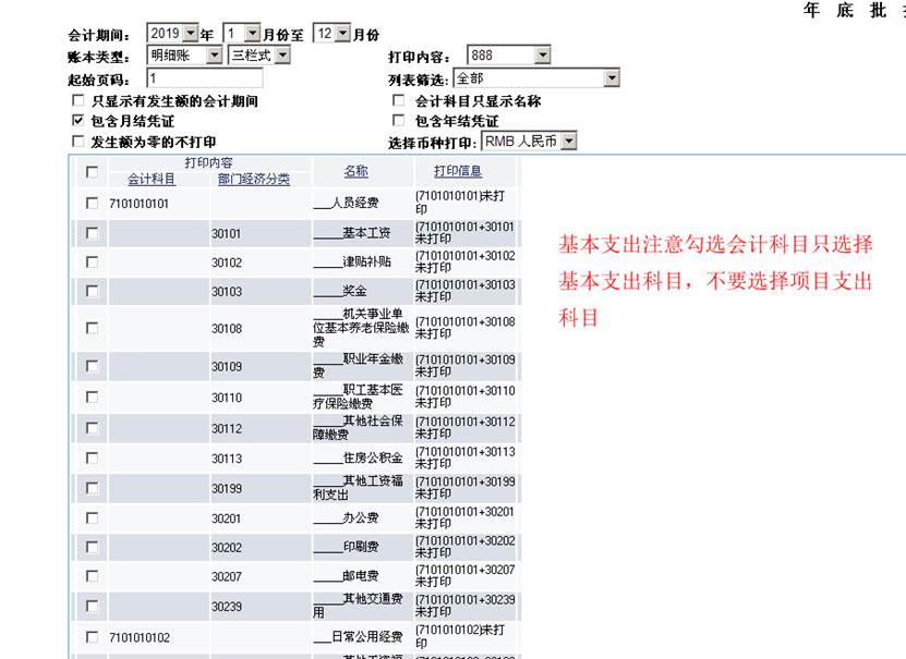 注意:由于今年新政府会计制度要求有月结转和年结转,因此在打印账表时注意勾选条件时一定不要忘记勾选包含月结和年结凭证,特别是涉及有结转的科目时一定不要忘记,不然账表打印出来就不完整。 根据会计制度要求,财政财务的账表体系设置分为科目账和辅助明细账,科目账分为科目总分类账和科目明细账;辅助明细账按设置情况,分为往来辅助明细账、功能分类辅助明细账、经济分类辅助明细账、项目辅助明细账、部门辅助明细账、资产分类辅助明细账等。 根据需要,年度批量打印时,所有账套的科目账必须打印科目总账余额表、科目总分账、科目明细账,并导出对应的账页目录(EXCEL格式,余额表不需导目录),打印后与账簿启用表、账簿封面、账表和账页等合并归档(装订顺序为账簿封面+启用表+目录+科目总账余额表+账页)。 根据实际情况,年度批打时必须打印对应的辅助余额表、辅助明细账(科目+往来、基本支出的科目+经济、项目支出的科目+项目+经济,此三类这必选项),设有部门辅助的,根据需要还应打印“科目+部门辅助明细账”。并导出对应的账表目录(同上),打印后与账簿启用表、账簿封面、账表和账页等合并归档(装订顺序为账簿封面+启用表+目录+辅助余额表+账页)。 所有余额表的打印跟平时查询打印一致,这里不再讲解,现着重介绍我们平时工作中必用的几类账页打印方案制作。同时注意会计期间一定要选择在1-12自然会计期间。 选择账务处理系统→定期处理→年底批打印→设置打印内容→新增 录入打印内容名称(可以按打印内容命名,鼠标点击顺序即为打印顺序),点击增加,增加需要打印的内容,最后点击确定即可完成打印方案设置。 选择会计期间,年度打印必须选择对应年度及1-12月;选择账本类型为总分类账,勾选筛选条件(勾选“只显示有发生额的会计期间”),选择需要打印的科目,最后点击打印即可完成选择方案打印内容。详见图示: 科目明细账的设置与科目总分类账的方案是一致的,不需要新增,只需在科目总分类账的基础上,将账本类型切换为“明细账”即可,其他设置不变。详见图示: 注意:科目账的总分类账和科目明细账方案为同一个,只是切换账本类型为总分类账和明细账的区别。 选择账务处理系统→定期处理→年底批打印→设置打印内容→新增 录入打印内容名称,点击增加,增加需要打印的内容,最后点击确定即可完成打印方案设置。 选择会计期间,年度打印必须选择对应年度及1-12月;选择账本类型为明细账,勾选筛选条件(勾选“只显示有发生额的会计期间”),选择需要打印的科目,最后点击打印即可完成选择方案打印内容。详见图示: 选择账务处理系统→定期处理→年底批打印→设置打印内容→新增 录入打印内容名称,点击增加,增加需要打印的内容,最后点击确定即可完成打印方案设置。 选择会计期间,年度打印必须选择对应年度及1-12月;选择账本类型为明细账,勾选筛选条件(勾选“只显示有发生额的会计期间”),选择需要打印的科目,最后点击打印即可完成选择方案打印内容。详见图示: 选择账务处理系统→定期处理→年底批打印→设置打印内容→新增 录入打印内容名称,点击增加,增加需要打印的内容,最后点击确定即可完成打印方案设置。 选择会计期间,年度打印必须选择对应年度及1-12月;选择账本类型为明细账,勾选筛选条件(勾选“只显示有发生额的会计期间”),选择需要打印的科目,最后点击打印即可完成选择方案打印内容。详见图示: 其它打印账面设置方法相同,注意在选择对应打印内容时注意账本类型(总分类账和明细账)的选择。 所有账面打印目录导出方法相同,这里只做一个显示。 待账页打印完成后打印方案就会自动把打印页码显示出来,点击导出目录,选择确定即可导出Excel文档目录,点击取消即可导出txt文本文档目录,选择存放路径,点击保存即可完成目录导出。 2.7.1.在打印方案设置完成后,先将打印方案预览,看看打印格式有错没有,如是否超出边框线等。 2.7.2.在打印前先将我们的会计科目设置为自动换行缩放 点击打印预览,选择设计按钮,选择显示会计科目名称,点击格式设置按钮,将对齐设置的换行自动缩放,因为每个单位的科目名称不一样,有的单位名称可能会很长,这时就需要自动缩放显示。选择单位名称,点击格式设置按钮,将对齐设置为单行自动缩放。最后不忘记点击保存。 2.7.3.打印方案命名。为方便后期查询及减少工作量,建议所有打印方案按打印内容进行命名。如“科目+项目+经济”、“科目+往来”等。