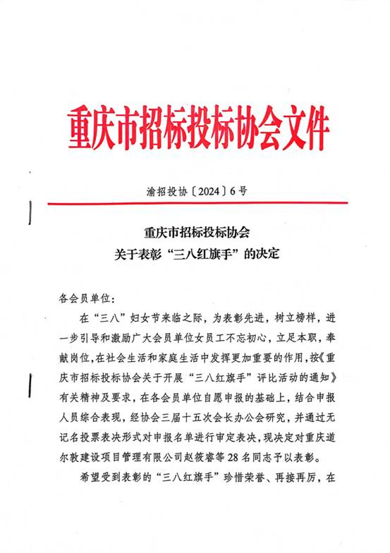 您当前位置:网站首页 >> 荣誉&案例 >> 重庆市招标投标协会关于表彰“三八红旗手”的决定